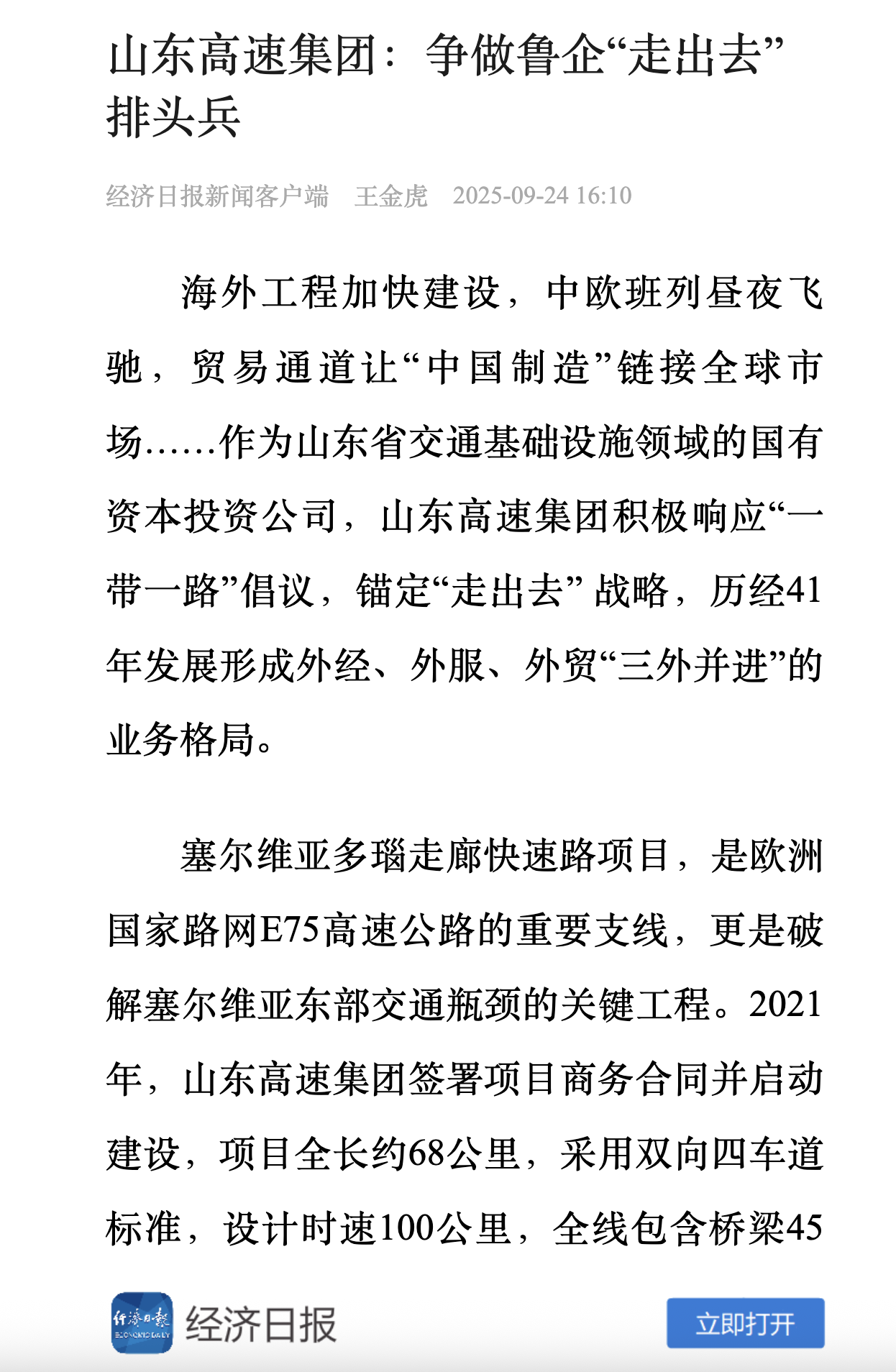 截至目前,山東高速在建境外項目125個,總合同額超560億元,塞爾維亞E763高速公路、阿爾及利亞東西高速等標志性工程,成為中國技術(shù)“走出去”的典范。